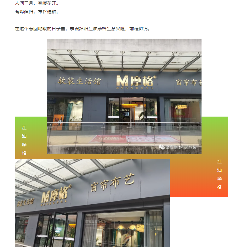 《摩格窗簾軟裝®喜訊》人間三月,春暖花開。恭祝綿陽江油摩格生意興隆,前程似錦。